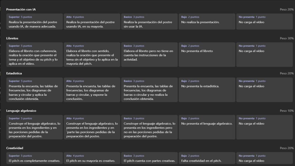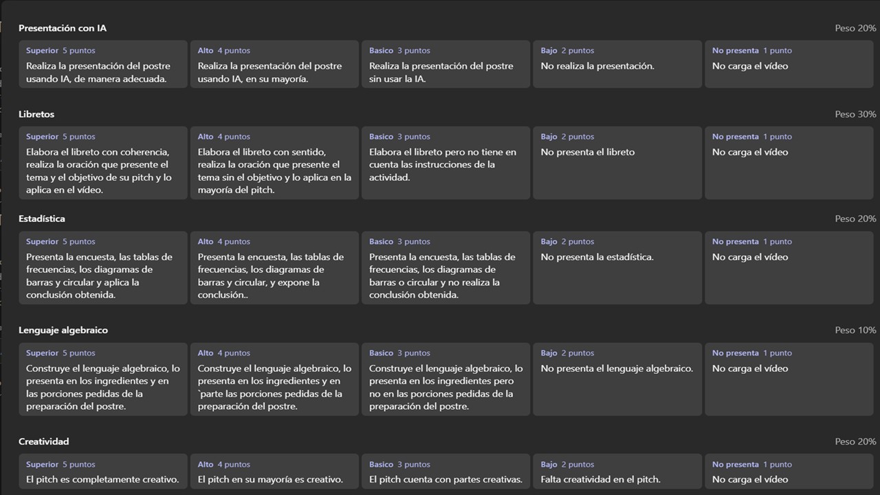 El Pitch (Vídeo) debe ser subido a la tarea de teams del grupo de algebra correspondiente teniendo en cuenta la siguiente rúbrica: