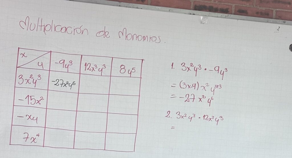 En el segundo encuentro la profesora realizará la explicación de la multiplicación de monomios y los estudiantes desarrollarán como ejercicio de aplicación la solución de la siguiente tabla: